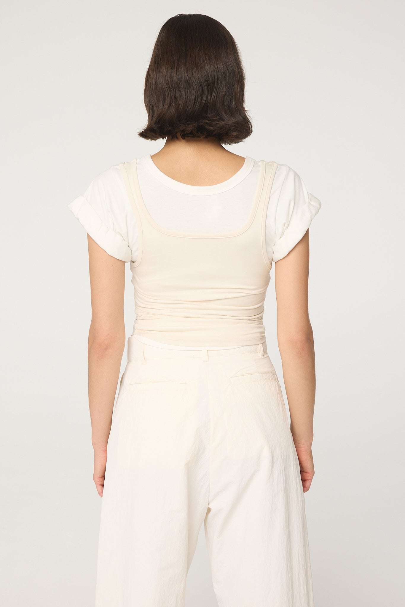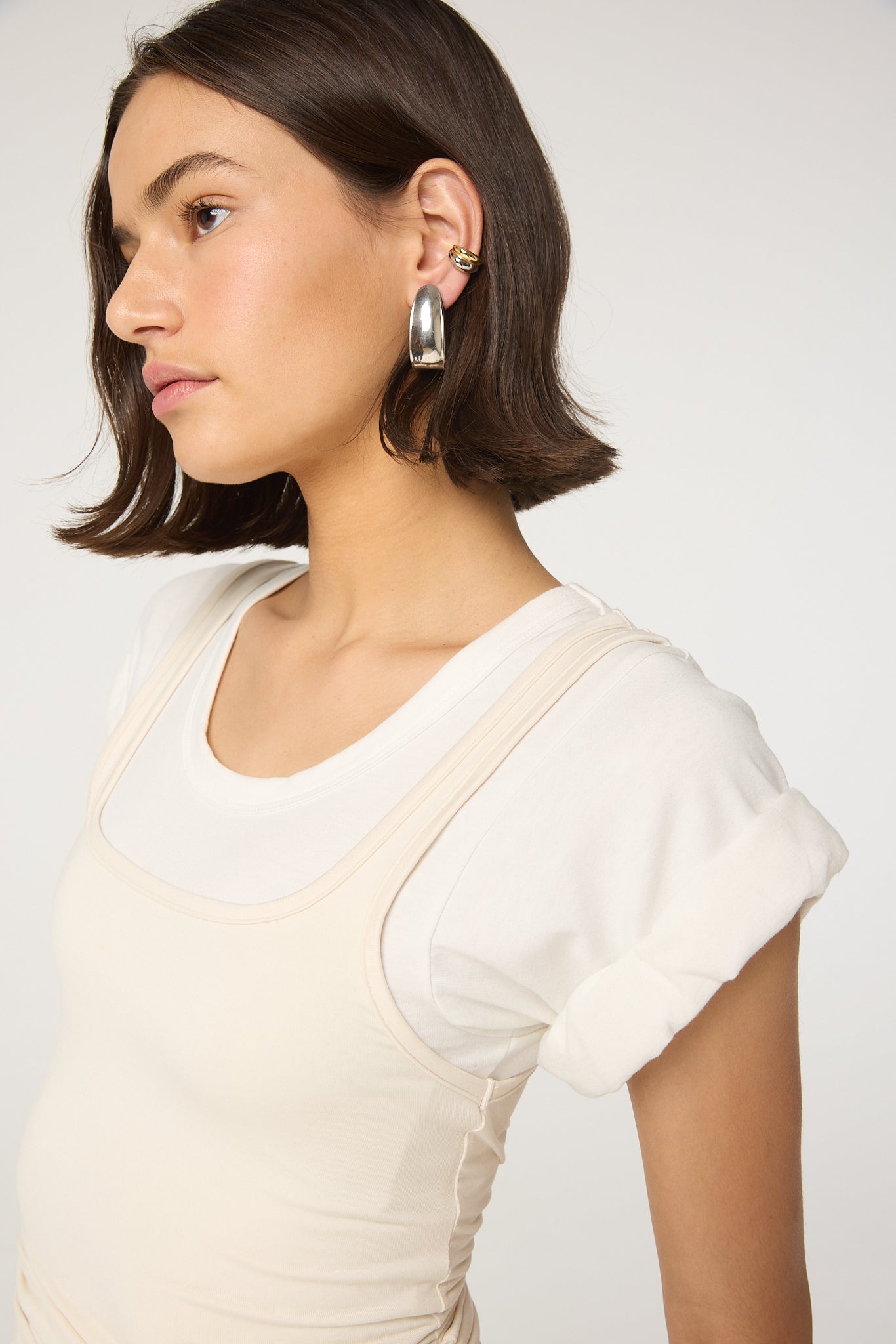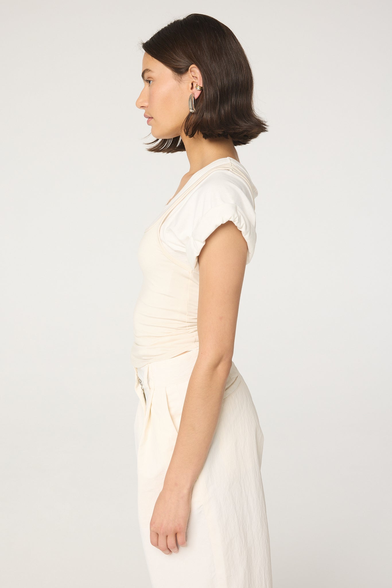 Made from a mid-weight cotton jersey with a stretch tank overlay, reminiscent of a vintage tee borrowed from the boys, the Daqi is our version of a t-shirt. This top features cuffed sleeves, a deep scoop neckline, Complete with your favorite denim or the Levin trouser for an effortless look.