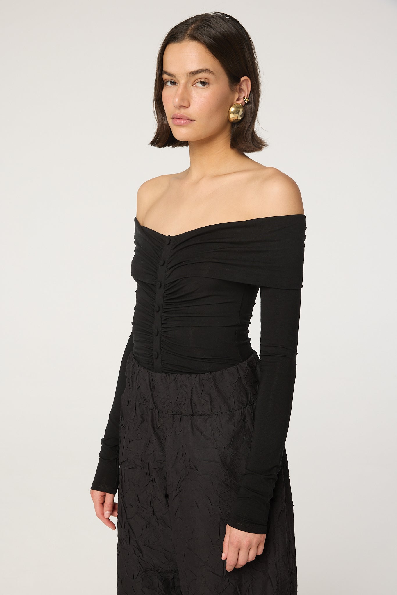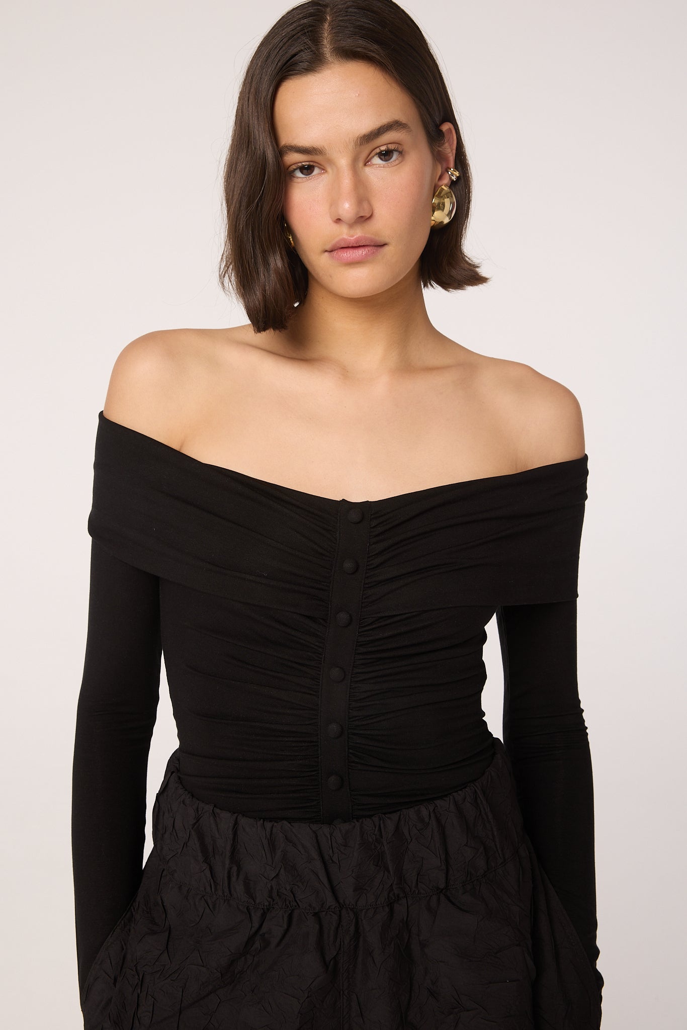 The Lunar is cut in our new mid-weight Tencel jersey. Soft to the touch, this body-hugging suit features an off-the-shoulder panel, slim longsleeves, shirring down the center seam, and a faux placket with covered buttons. Pair it with your favorite denim or our Ritsu skirt and boots for a cold-weather look.