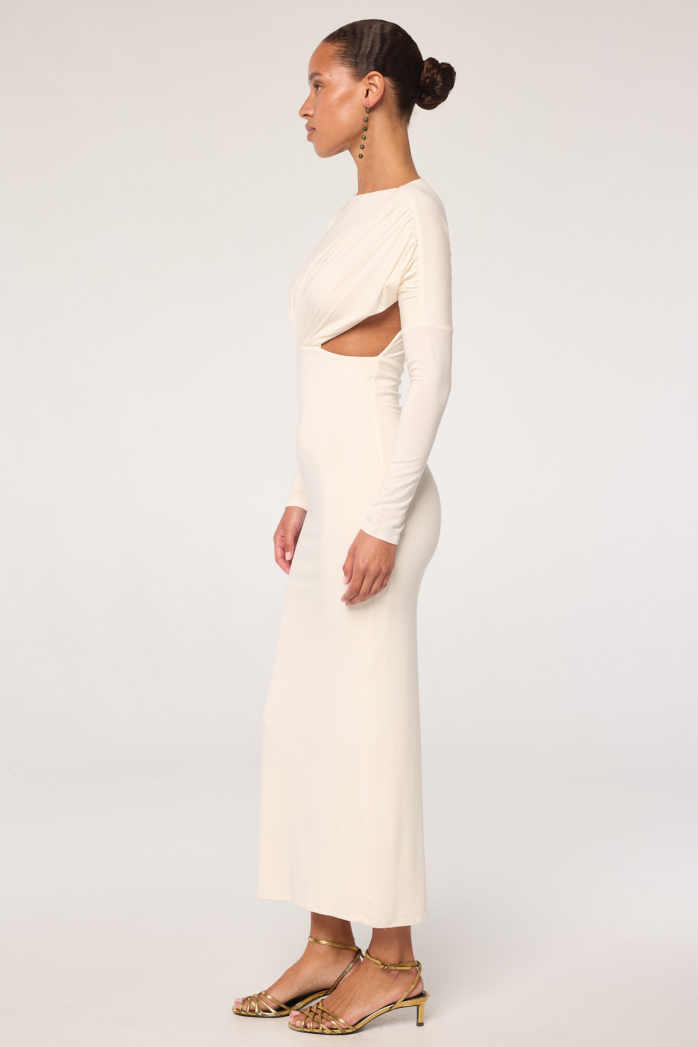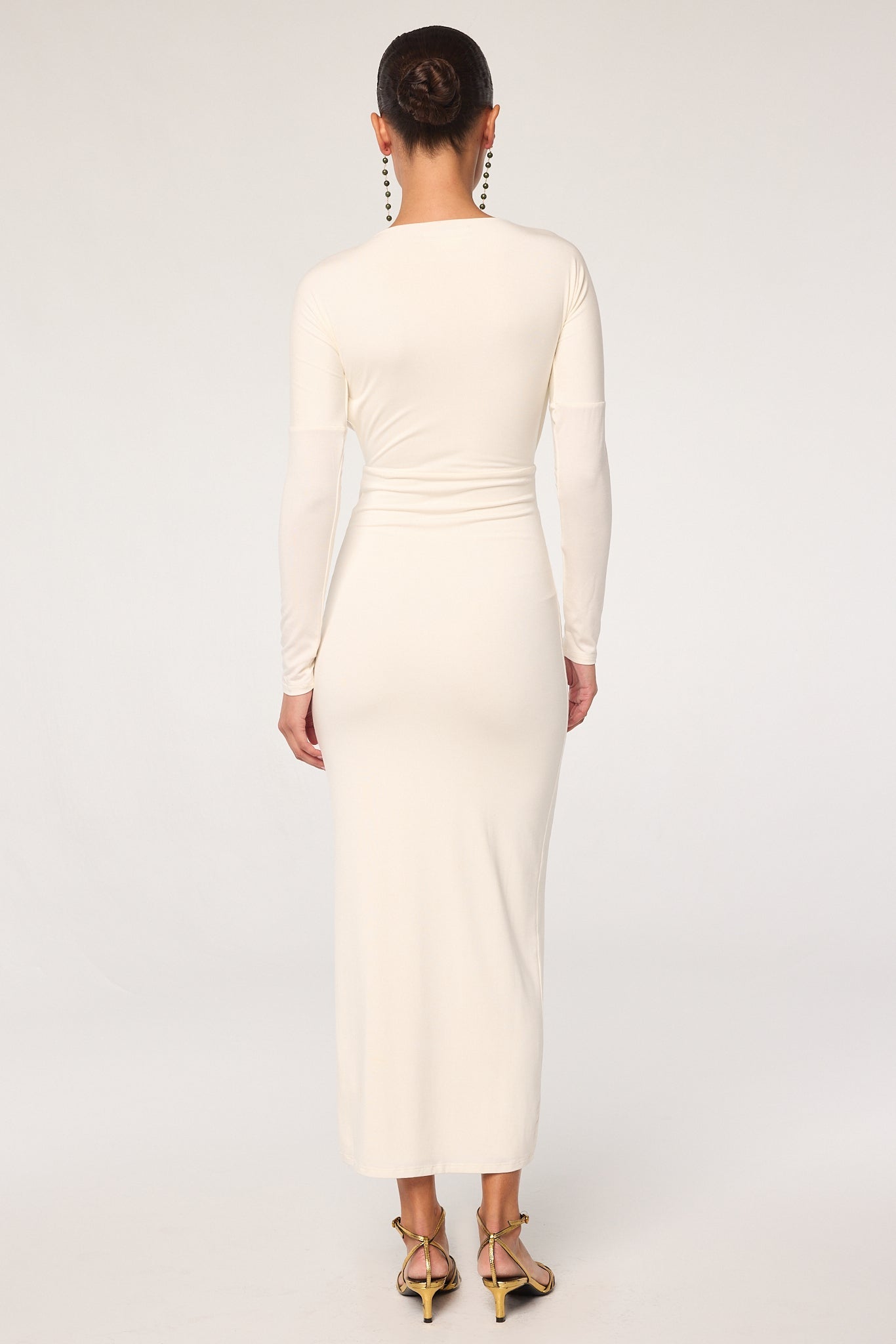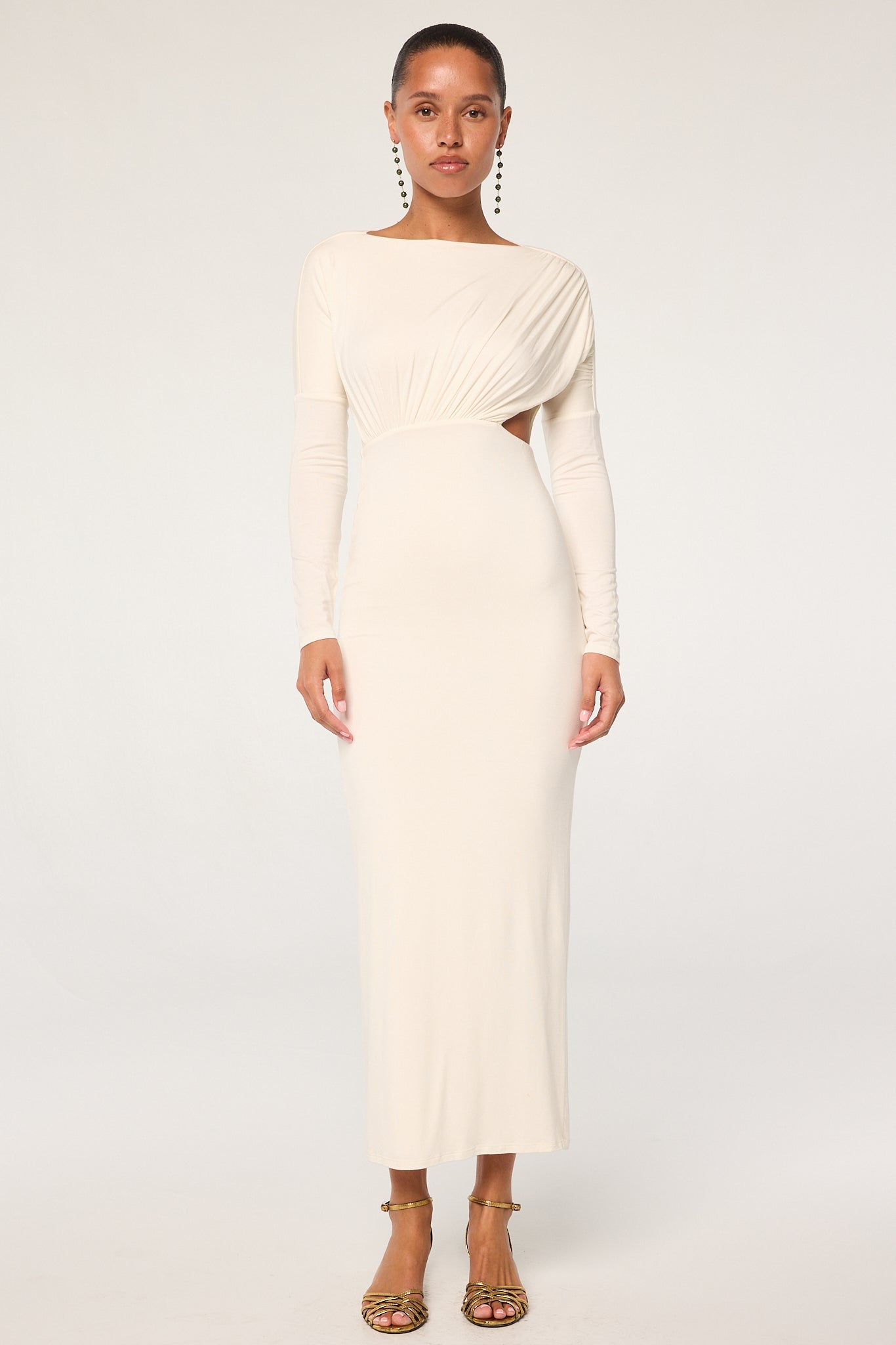 The Pascal: an evening dress that is comfortable, easy-to-wear, and effortlessly sexy. Crafted from our signature micro-modal jersey, the Pascal is soft against the skin and features shirring at the shoulder that drapes asymmetrically with a subtle cut-out to bare a sliver of skin. This dress is double-lined to minimize sheerness and pairs well with anything from strappy flat sandals to knee high boots and dark lips.