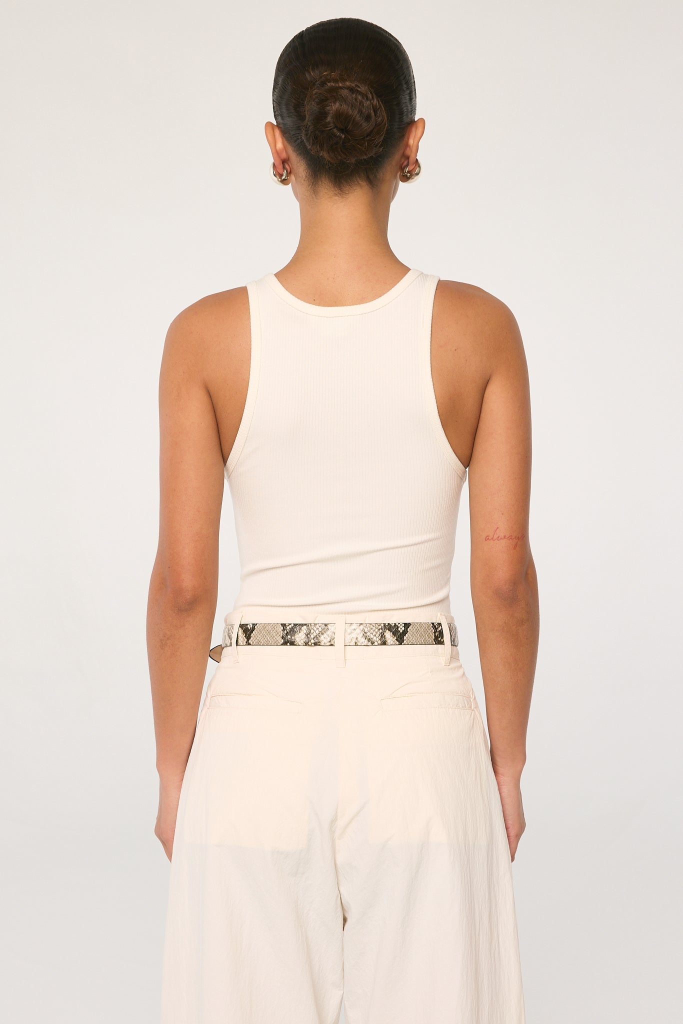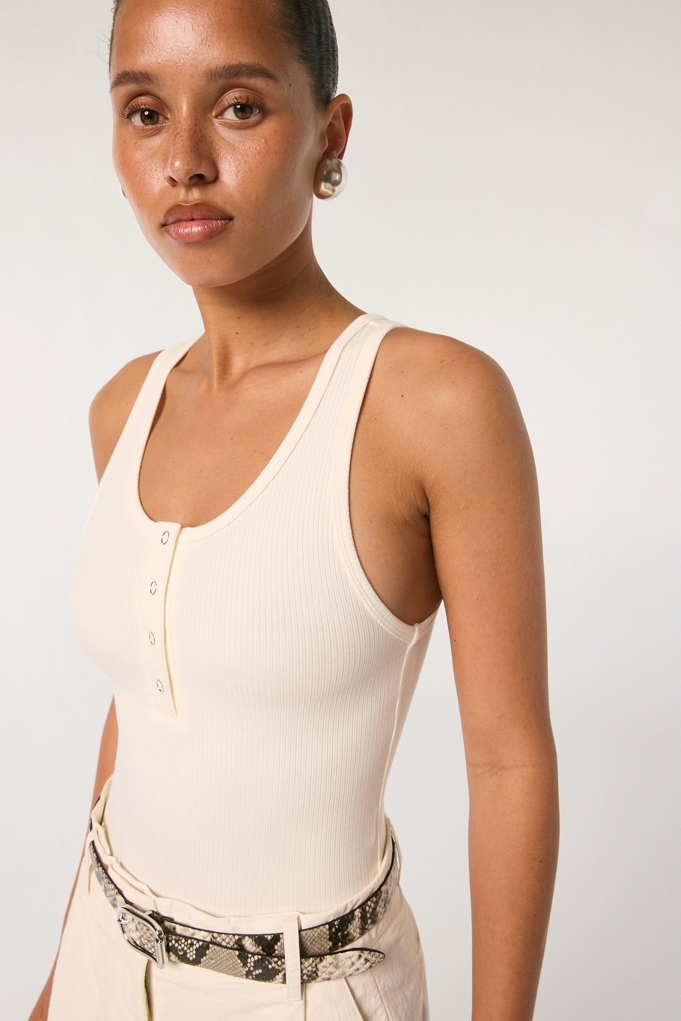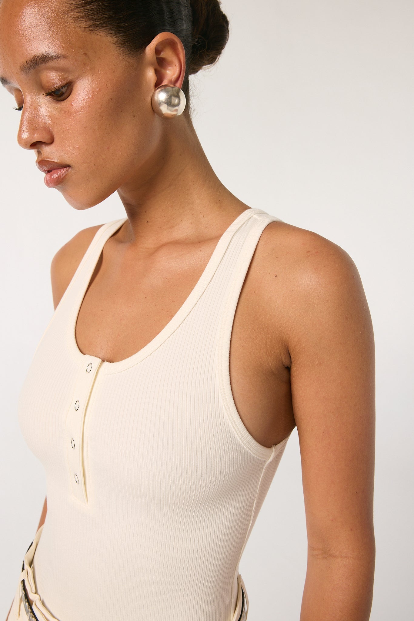 Re-introducing the Adrienne, a shaping bodysuit that first made it's debut back in 2015, now back as a part of our Archive Capsule Collection. Designed for a close fit in a heavy 4x2 rib selected for its stretch and structure, the sleek silhouette features a scoop neckline secured with four nickel snaps. Pair with the Janae skirt or your favorite denim.