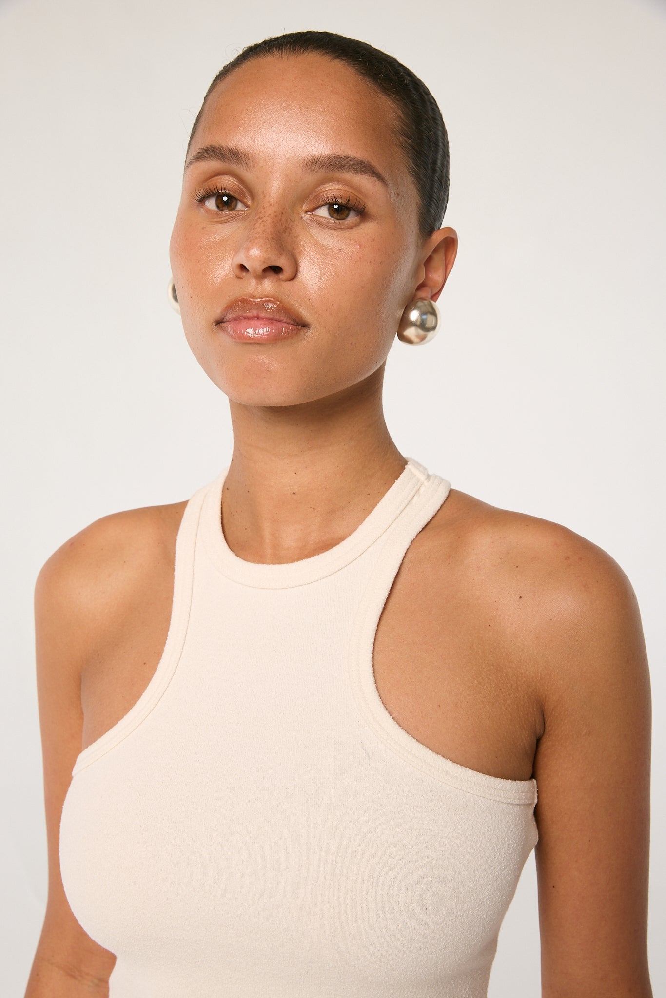 Cut from a Japanese thick terry textured fabric, the Tatum is a racerback tank and features a flattering neckline and a slightly cropped hem. Pairs well with the matching Kiko short or low-rise wide leg trousers.